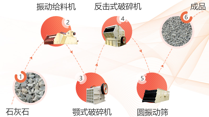 物料由GZD-1500×5600振動給料機均勻、定量、連續地輸送進PE-1200×1500鄂式破碎機,進行粗碎,粗碎后的石料由輸送機送到PF-1520反擊式破碎機進行細碎;破碎后的物料由輸送機送進振動篩進行篩分,符合粒度要求的石料由成品輸送機送往成品料堆;不符合粒度要求的物料由輸送機返料送到PF-1520反擊式破碎機再次破碎,形成閉路多次循環。生產過程中,各級設備配備合理,提高了生產效率。